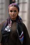 The Petal Pusher Pre-tied Head Scarf by TUK features a striking botanical design layered with blooming florals in deep red, pink, violet, and earthy tones. Set against a bold black background, the vivid blossoms create a vibrant contrast while the striped border in burgundy, ivory, and cobalt adds a structured, modern finish. Crafted with precision folds, the scarf is pre-tied for effortless wear, blending functionality with standout artistry. A perfect fusion of elegance and edge, it transforms a classic accessory into a statement piece.