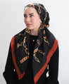 TUK Ironed Out Pre-tied Head Scarf featuring a bold gold chain grid pattern on black fabric with a brown border for a chic, timeless look.