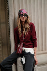 The background is a muted olive green, which enhances the vivid contrast of the florals while giving the piece a timeless, wearable versatility. A bold border with clean stripes in cream, burgundy, and indigo frames the scarf, adding a modern graphic edge to the lush garden theme. Perfectly balanced between elegance and statement-making, this scarf combines meticulous floral detailing with contemporary color blocking.