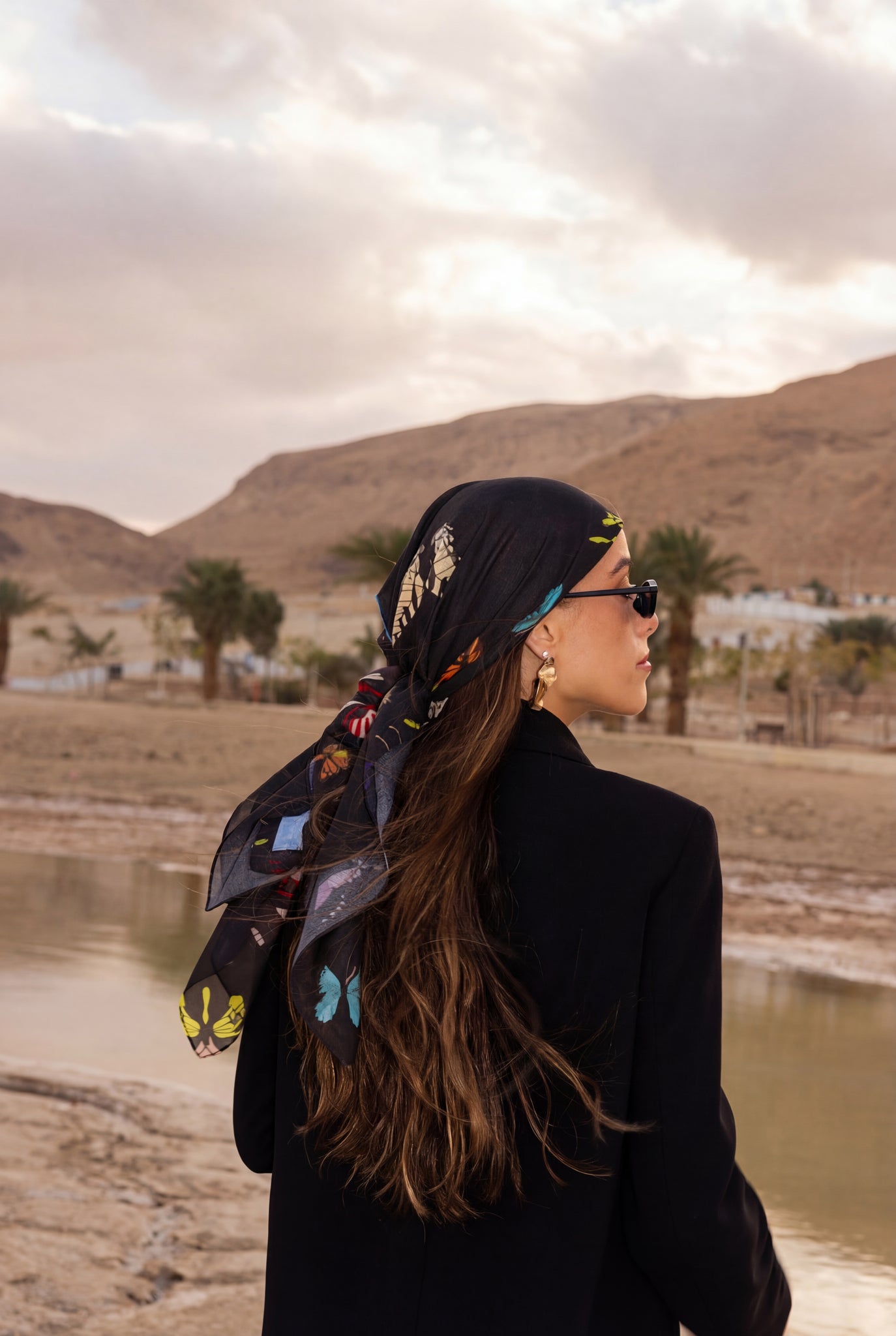 The Night Shift is classic black head scarf with scattered, colorful butterflies for contrast. A little playful, still sleek, and surprisingly versatile.